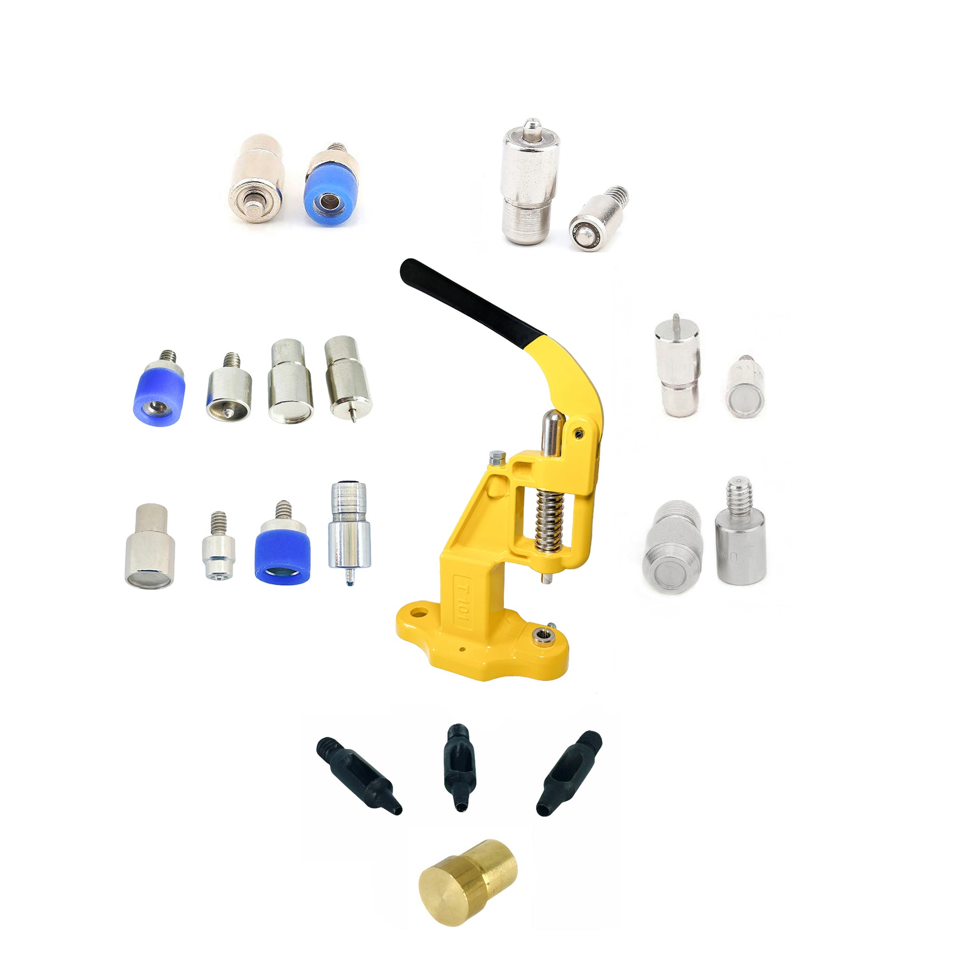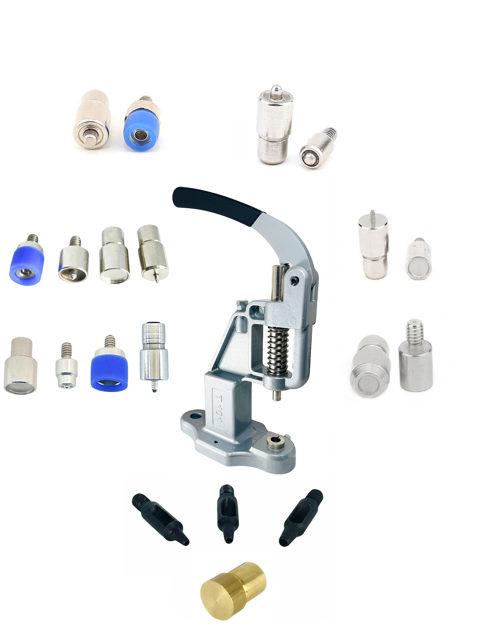 - The standard kit includes a Hobby Trendy Hand Press, one 9mm single cap and 9 mm double cap rivet dies; No 3 Eyelet / grommet dies; Open Ring Snap Button Dies, 12.5 mm ( Line 20) fashion spring snap button dies , 15 mm Utility Spring snap button dies and 3 hole punches that are 2mm, 2.5 mm and 3 mm that come with one base